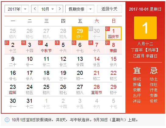 2017年10月1日(星期日)至2017年10月8日(星期日)調(diào)休放假共8天,其中9月30日(星期六)調(diào)休上班,10月9日(星期一)開始正常上班。