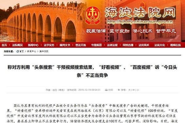 據海淀法院官網消息,因認為其視頻產品被今日頭條作為關鍵詞,干預搜索結果,百度以不正當競爭為由將今日頭條運營商北京字節跳動科技有限公司訴至法院,要求其立即停止不正當競爭行為。
