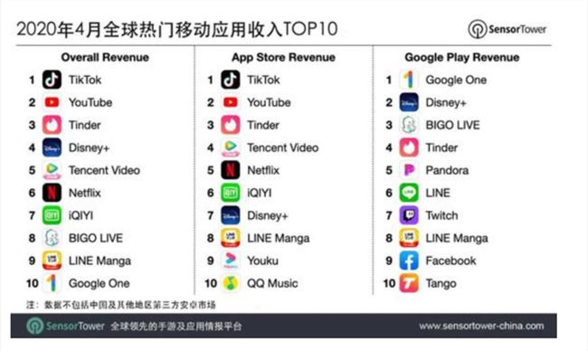 這并非空穴來風。數日前,Sensor Tower數據顯示,字節跳動旗下抖音及TikTok于 2020 年 4 月在全球蘋果App Store和谷歌Play Store獲取的金額已經超過 7800 萬美元,首次超越了YouTube的 7600 萬美元。