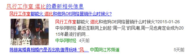 這是搜索風(fēng)行工作室,出現(xiàn)的新聞,兩者有什么關(guān)聯(lián)性呢?其實(shí)兩者沒(méi)有關(guān)聯(lián),但逗比和他媽DE網(wǎng)絡(luò)營(yíng)銷抓住時(shí)機(jī),寫(xiě)了一篇文章“風(fēng)行工作室都能火,逗比和他媽DE網(wǎng)絡(luò)營(yíng)銷什么時(shí)候火”投放到門戶網(wǎng)站,所以網(wǎng)民在搜索風(fēng)行工作室的時(shí)候,逗比和他媽DE網(wǎng)絡(luò)營(yíng)銷也曝光了,這就是“借勢(shì)”,利用熱點(diǎn)新聞,植入自己的品牌或者產(chǎn)品。