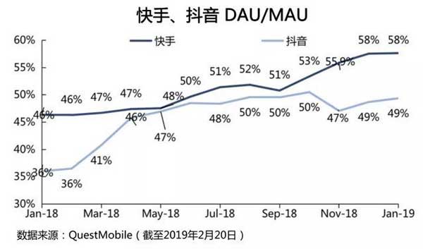 DAU/MAU可以反映出用戶粘性,從數(shù)據(jù)可見(jiàn),快手的DAU/MAU一直高于抖音,并在2018年11月之后逐步擴(kuò)大,可見(jiàn)快手的用戶粘性高于抖音,快手用戶對(duì)平臺(tái)的忠誠(chéng)度更高。