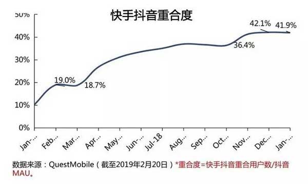 從快手抖音用戶重合度曲線可見(jiàn),從2018年4月開(kāi)始,快手抖音的用戶重合度處于上升趨勢(shì),但在2019年1月出現(xiàn)小幅下降。不過(guò),截止2019年1月,二者的用戶重合度已經(jīng)達(dá)到了41.9%。