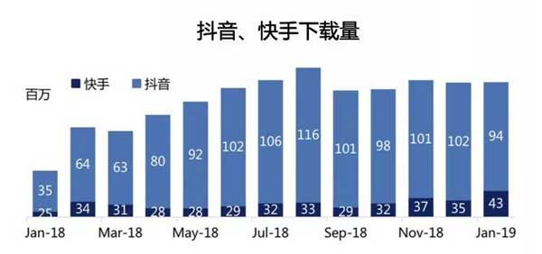 下載量方面,從體量而言,抖音遠(yuǎn)遠(yuǎn)大于快手。在2018年1月至2019年1月期間,抖音單月最高下載量為11600萬(wàn),快手最高為4300萬(wàn)。