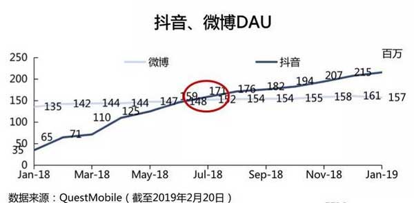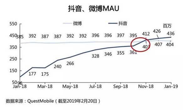 2018年7月,抖音日活為1.59億,首次超過(guò)微博(1.48億),隨后二者的日活差距不斷擴(kuò)大;2018年11月,抖音月活為4.12億,首次超過(guò)微博(4.03億)。自此,“兩微一抖”的格局真正形成,抖音成為新的國(guó)民APP。