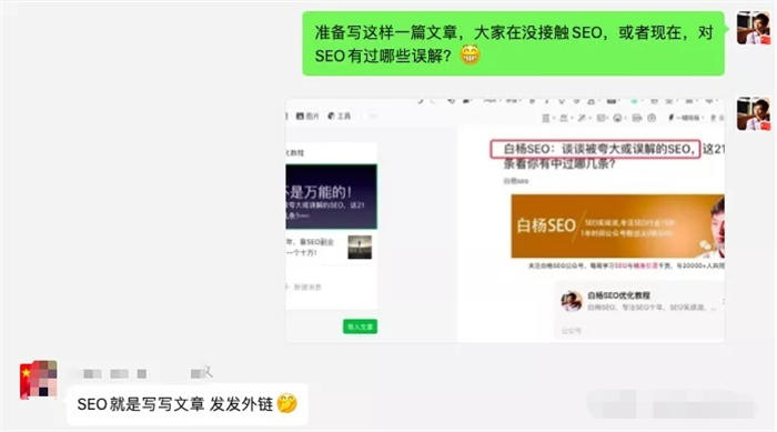 為什么為有這個認為呢,因為我除了自己公眾號、博客以及自媒體發布后,受一些第三方知名媒體轉載,所以每天都有5-10人加過來。之前有個人加過來問我,說白楊老師,你收徒弟嗎,跟你學會SEO是不是就可以賺錢了?我回復說,一則我不再網上收徒,二則SEO學會了不等于賺錢,我也不會賺錢,怎么教你賺錢呢?
