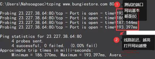 如果網站禁ping了,推薦使用tcping測試端口(該命令所需軟件需要下載,添加到系統環境變量中)