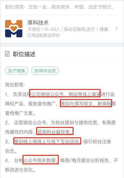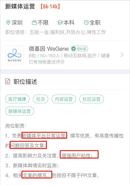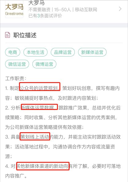 我們不妨先從新媒體崗位需求方考慮一下,到招聘網(wǎng)站上扒拉一下新媒體運(yùn)營(yíng)崗的JD(招聘需求),看看企業(yè)需要什么樣的新媒體人才。