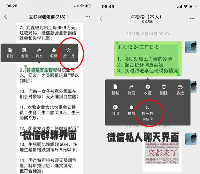 “搜一搜”最方便的是,只要你在微信內容復制任何東西都會出現“搜一搜”的界面。微信群、個人聊天窗口都可以。這也間接增加了搜一搜的MAU。