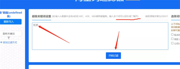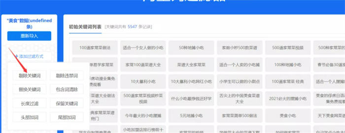 過(guò)濾掉一些你不要的詞語(yǔ),比如我這批美食標(biāo)題里面,有一些是帶有「視頻」的標(biāo)題,我不需要這樣的標(biāo)題,我就可以輸入「視頻」兩個(gè)字,就可以過(guò)濾掉全部帶有「視頻」兩個(gè)字的標(biāo)題。