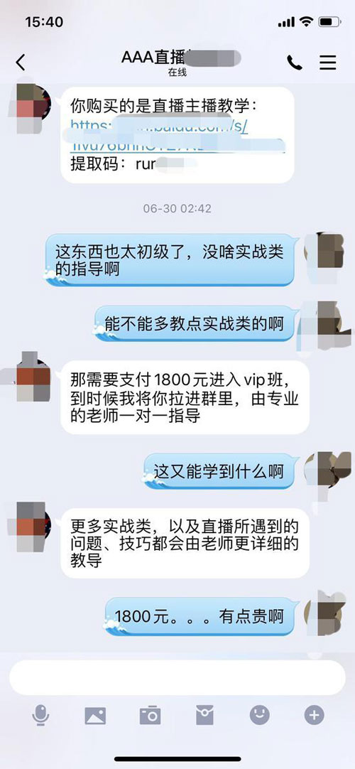 記者注意到,這套標(biāo)注著“基礎(chǔ)入門”、“導(dǎo)流方案”、“賣貨思維”等文件的課程,僅是極為簡單地介紹了直播過程中需注意的事項(xiàng),并沒有任何實(shí)操課程。當(dāng)記者以“課程過淺”,提出希望能多學(xué)點(diǎn)干貨時(shí),對(duì)方稱89元只是基礎(chǔ)培訓(xùn)的費(fèi)用,如果要學(xué)到更多的實(shí)戰(zhàn)類技巧,則需要再支付1800元加入VIP班。