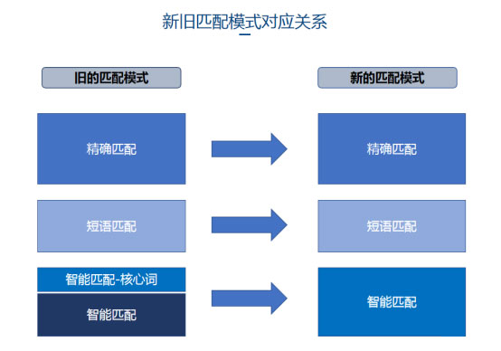 匹配模式3.0:2019年匹配模式繼續升級,調整為四種匹配模式 精確匹配,短語匹配,智能匹配-核心詞,智能匹配