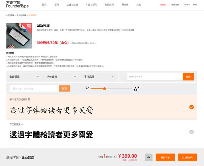 如果你的鏈接真的是非常的多,你根本不知道應(yīng)該如何來進行修改的話,老白也建議你,不要隨意的聽信線上通知你的外包客戶,說授權(quán)要4000多一份等信息,我們也完全的可以去方正的官網(wǎng)進行購買,一般情況一個字體的使用費用是399/50年: