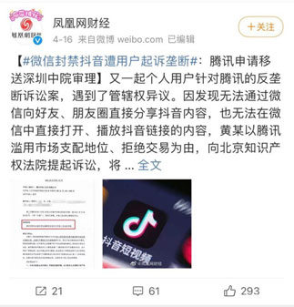 抖音方面主張,騰訊通過微信和QQ限制用戶分享來自抖音的內容,構成了《反壟斷法》所禁止的“濫用市場支配地位,排除、限制競爭的壟斷行為”,要求法院判令騰訊停止這一行為,并賠償抖音9000萬元。
