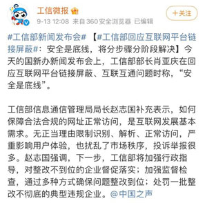 “當前,我們正在按照專項行動的方案安排,指導相關互聯網企業開展自查整改。但在自查整改中,我們了解到,部分互聯網企業對屏蔽網址鏈接問題的認識與專項行動要求還有一定的差距。為此,我們采取了行政指導會等多種形式,進一步幫助企業認識到,互聯互通是互聯網行業高質量發展的必然選擇。”趙志國在發布會上介紹。