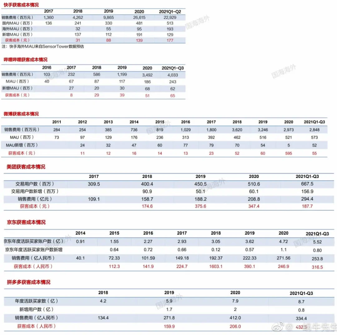 互聯網的趨勢是流量越來越貴,吳曉波最新的演講里提到(后我又查資料進行了補充),2021年互聯網公司的獲客成本: