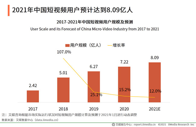 iiMedia Research(艾媒咨詢)數據顯示,中國短視頻用戶規模增長勢頭明顯,2020年已超7億人,預計2021年增至8.09億人。艾媒咨詢分析師認為,短視頻作為4G時代快速發展的移動產品類型,能聚合社交、電商等屬性,覆蓋人群規模不斷擴大,在網民中的普及度一直提高,也誕生了抖音、快手等超級應用平臺。