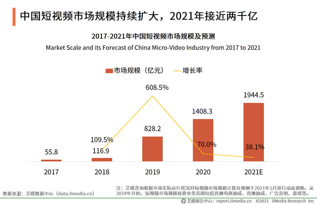 iiMedia Research數據顯示,2020年中國短視頻市場規模達到1408.3億元,繼續保持高增長態勢,2021年預計接近2000億元。艾媒咨詢分析師認為,近年短視頻平臺不斷在商業模式上進行探索,一方面成為創新性新媒體營銷平臺,另一方面也結合直播帶貨迎來新的增長點,市場仍將進一步發展。
