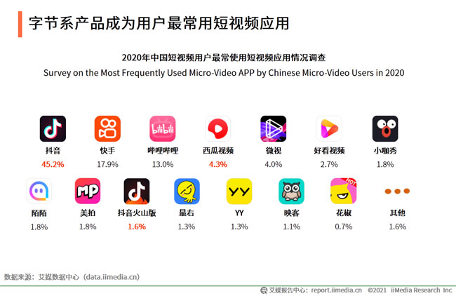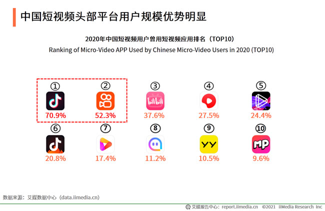 iiMedia Research(艾媒咨詢)數據顯示,分別有70.9%和52.3%的受訪中國短視頻用戶表示使用過抖音和快手。艾媒咨詢分析師認為,抖音及快手在短視頻領域頭部優勢明顯,快手發展起步早,用戶基礎深厚,且積極發展電商和游戲直播等業務,成為頭部典型代表;抖音雖然發展時間較短,但追趕勢頭明顯,入駐KOL數量多,帶貨推廣情況良好,也成為用戶最多的短視頻平臺。