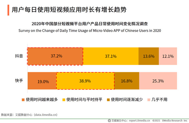 iiMedia Research(艾媒咨詢)數據顯示,37.2%的用戶表示每天使用抖音的時間越來越多,分別有37.1%和38.9%的用戶表示使用抖音和快手的時間與平時持平。艾媒咨詢分析師認為,短視頻應用近年逐漸在維護用戶粘度、提高社交屬性等方面發力,因此用戶群體有一定增加短視頻應用使用時長的趨勢;在短視頻平臺方面,抖音的優勢增加了用戶對于內容的好感度和平臺的認可度,也促使用戶使用時長增加。