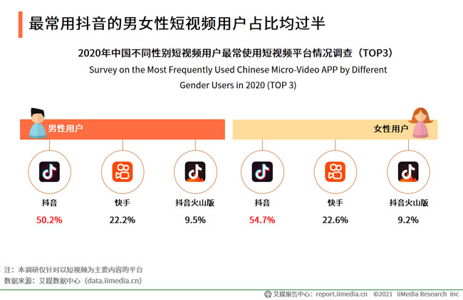 iiMedia Research(艾媒咨詢)數據顯示,抖音、快手和抖音火山版是受訪用戶最常使用短視頻應用的前三名。其中男性與女性用戶最常用產品均為抖音,分別占比50.2%及54.7%。艾媒咨詢分析師認為,得益于字節跳動系的生態圈以及抖音的內容質量,抖音擁有巨大的用戶接入口,因此抖音成為了短視頻用戶最常用產品,在各性別人群中均具有忠實用戶群體。