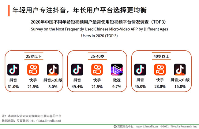 年輕用戶專注抖音,年長用戶平臺選擇更均衡