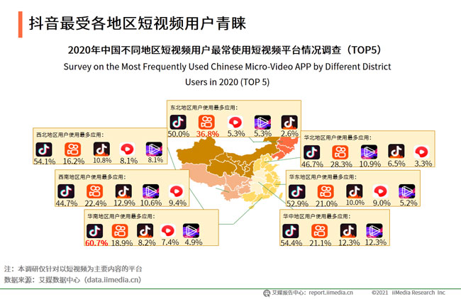 iiMedia Research(艾媒咨詢)數據顯示,2020年中國各個地區用戶使用最多的短視頻應用均為抖音,抖音使用率最高的地區是華南地區,快手使用率最高的地區是東北地區。艾媒咨詢分析師認為,抖音在各地域市場均具有較高的用戶偏好;快手在北方地區的市場基礎相對更好,但也與抖音存在一定差距。