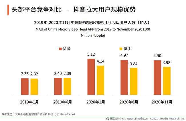 iiMedia Research(艾媒咨詢)數據顯示,抖音用戶規模由2019年1月的2.36億人增長至2020年11月的4.90億人,同時與快手用戶規模間的差距愈發明顯。艾媒咨詢分析師認為,抖音憑借內容分發和流量入口優勢以及良好的海外發展勢頭后來居上,已逐漸確立短視頻市場用戶霸主地位。快手在用戶方面雖然規模也快速增長,但是在與抖音的用戶競爭中暫時處于下風,未來圍繞用戶流量的競爭仍是短視頻行業的重點。