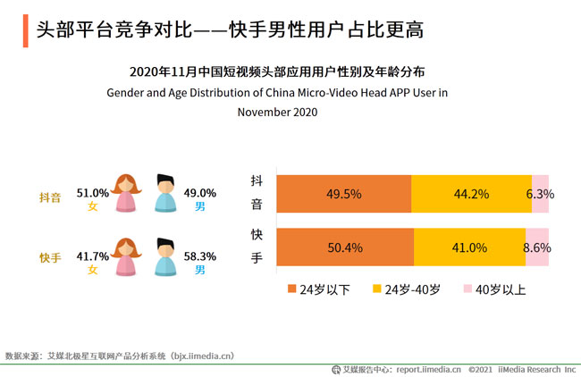 iiMedia Research(艾媒咨詢)數據顯示,抖音男性和女性用戶占比都在50%左右,而快手男性用戶比女性用戶人數比例高16.6%;年齡構成方面兩大平臺都有明顯的年輕化特點。艾媒咨詢分析師認為,隨著抖音用戶體量擴大,其用戶在性別構成上分布更為均勻;快手在平臺內容上更多融入游戲直播內容,用戶結構更偏向于以男性為主;此外基于短視頻形式創新特性,對于年輕用戶吸引力高,頭部平臺均以年輕人群為用戶主力。