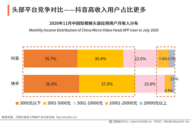 iiMedia Research(艾媒咨詢)數據顯示,抖音和快手的高低收入人群用戶占比有一定的差異,快手月收入5000元以下的用戶占比73.8%,而抖音為66.1%;11月抖音月收入在10000元以上的用戶占比11.3%,而快手僅為6.4%。艾媒咨詢分析師認為,目前頭部短視頻平臺以中低收入用戶群體為主,但抖音對于高收入用戶的覆蓋正在提高,用戶消費潛力相對更大。
