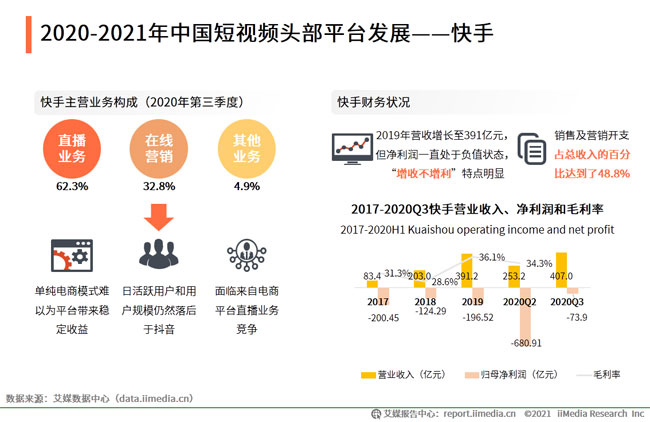 艾媒咨詢分析師認為,作為短視頻領域頭部平臺,快手積極尋求資本化,IPO在即。從其招股說明書披露數據來看,快手雖然營收持續增長,但利潤一直處于虧損狀態,呈現明顯的“增利不增收”特點,其收入的發展依靠高昂成本換取,長期來看企業發展可能存在風險。