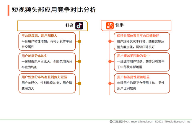 艾媒咨詢分析師認為,在頭部平臺用戶競爭對比中,抖音憑借平臺內容分發機制獲得用戶的青睞且用戶粘度更大。快手用戶標簽化特點更明顯,且營銷運營力度高,在品牌聲譽建設和推廣方面表現出色,但也因此造成運營成本大的問題,目前尋求電商化發展和IPO上市應對。