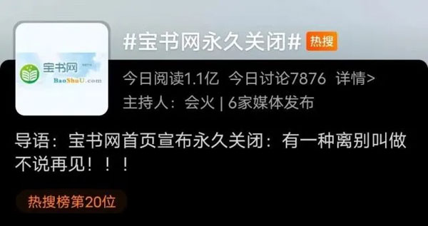 6 月 30 日,寶書網(wǎng)發(fā)布公告稱,為響應(yīng)國家號召,本站將永久關(guān)閉。