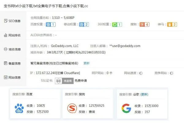 SEO 信息上顯示,關(guān)于寶書網(wǎng),百度收錄 108W ,搜狗收錄 125W ,谷歌收錄 15W 。