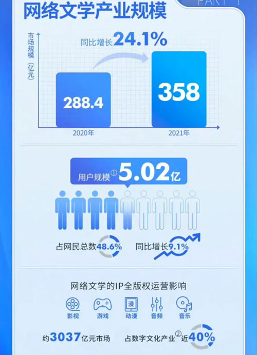 報告中顯示2021年我國網(wǎng)絡(luò)文學(xué)用戶規(guī)模達 5.02 億,同比增長了 24.1% 。