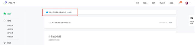 小程序管理后臺頂部會提示“小程序需補充備案信息”的提醒,點擊【去備案】即可進入備案流程