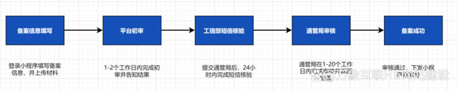 備案整體流程總共分為五個環節:備案信息填寫、平臺初審、工信部短信核驗、通管局審核和備案成功。