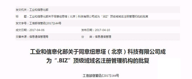 嚴格來說,誕生于2001年的.biz算是老牌國際通用頂級域名了,域名后綴具有“商務”的含義,目前域名全球注冊量已突破220萬。此次按照《中國互聯網絡域名管理辦法》規定審查,紐思塔(北京)科技有限公司,成為了國內運營.biz域名的注冊管理機構。