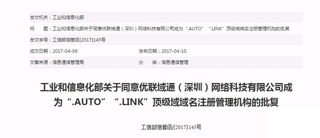 而.auto和.link都屬于新頂級域名后綴,是國內第四批通過備案的新頂級域名。此次按照《中國互聯網絡域名管理辦法》規定審查,優聯域通(深圳)網絡科技有限公司成為了國內運營.auto和.link的注冊管理機構。