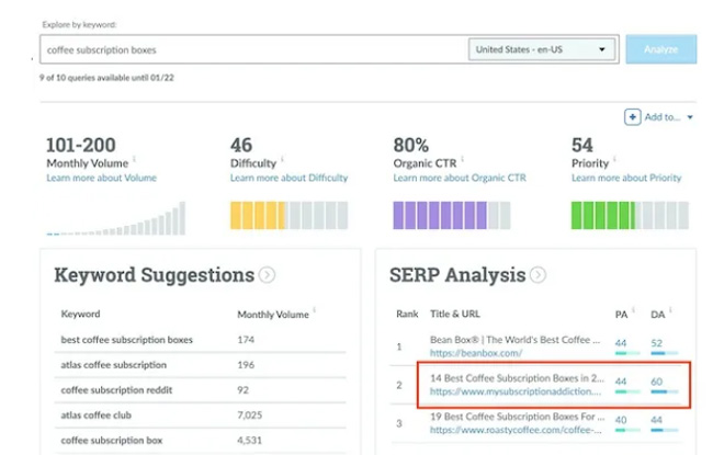 我建議針對關(guān)鍵字難度分?jǐn)?shù)小于或等于您的域權(quán)限的關(guān)鍵字優(yōu)化您的網(wǎng)頁。例如,如果您想對關(guān)鍵字“咖啡訂閱盒”進(jìn)行排名,則可能需要至少 60 的 DA才能在第一頁上排名。
